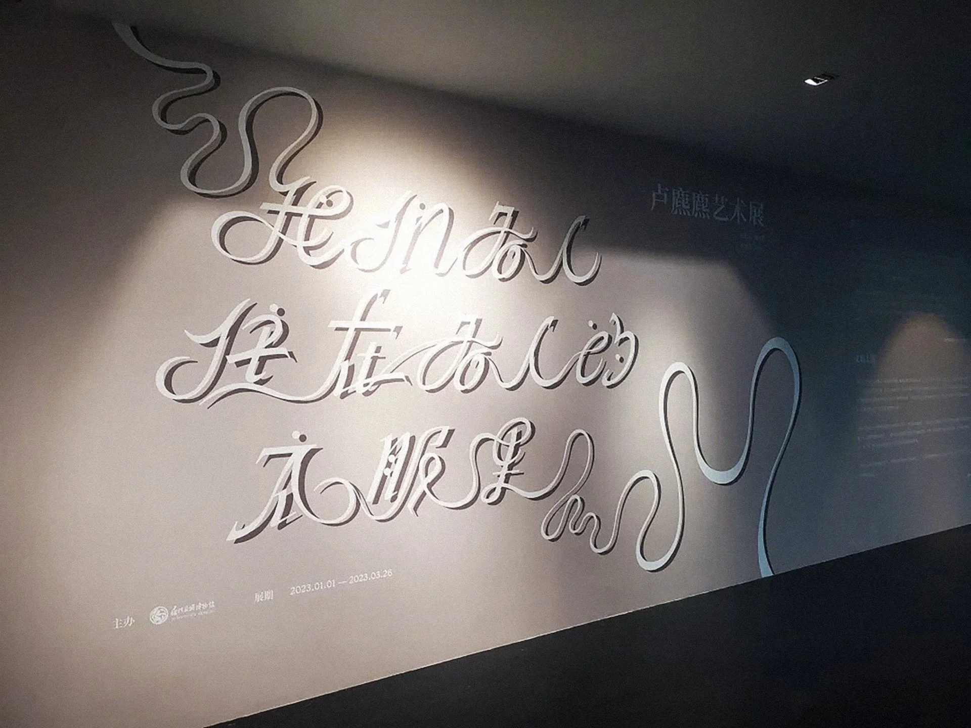 The custom Chinese typeface I designed for the exhibition incorporates elements from cursive Latin letters to reflect the elegant and soft art style of the artist. My design features fluid lines and shapes, intentionally depicting the prominent use of yarns in the artist’s work. The color palette of pink, warm gray, and silver aims to create a sophisticated and delicate feel.