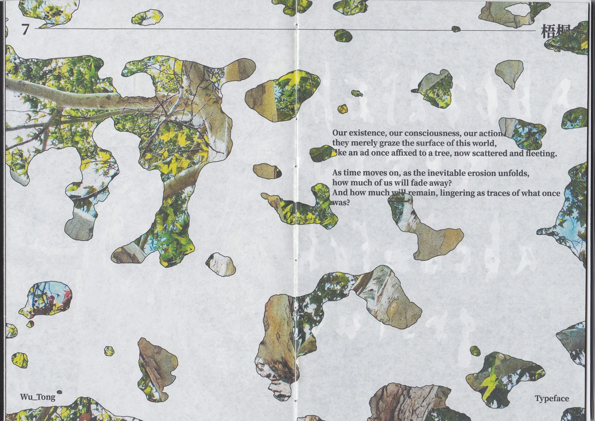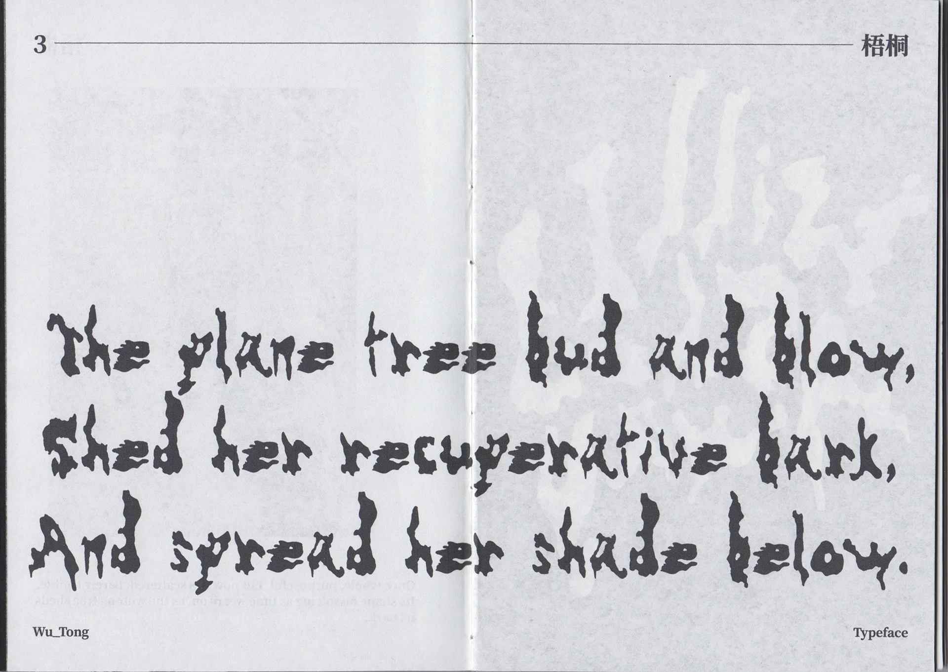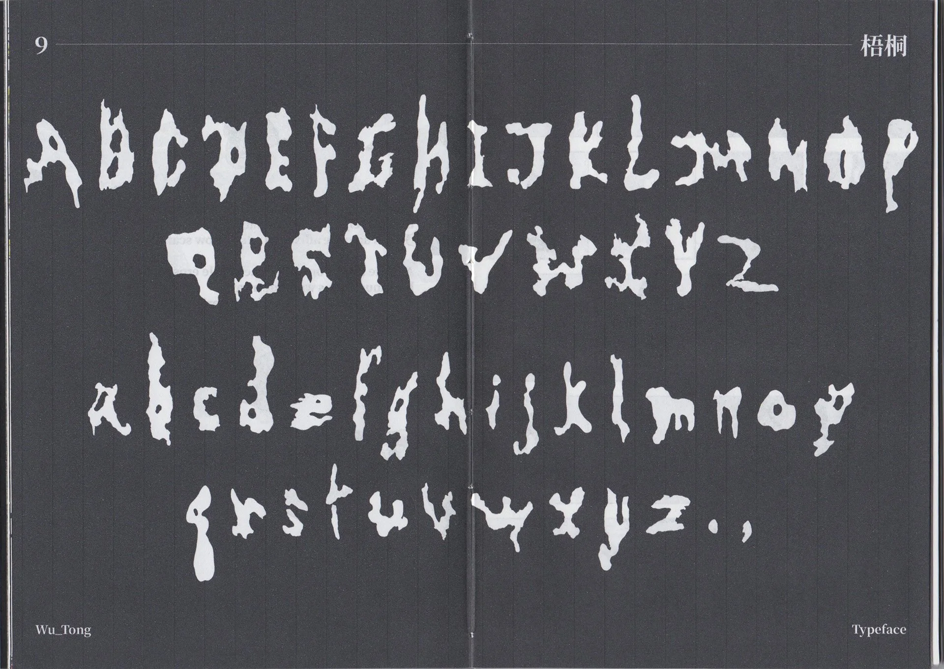 “Wu Tong” is a typeface I designed based on the organic shapes found on plane trees which formed themselves by the shedding of bark. This project started when I was walking in the street of Shanghai and seeing an ad. It sparked my realization of the transient nature of life and inspired me to capture a font that embodies this fragmented aesthetic, conveying the delicate balance between growth and decay, much like the ever-changing surface of the tree’s bark.